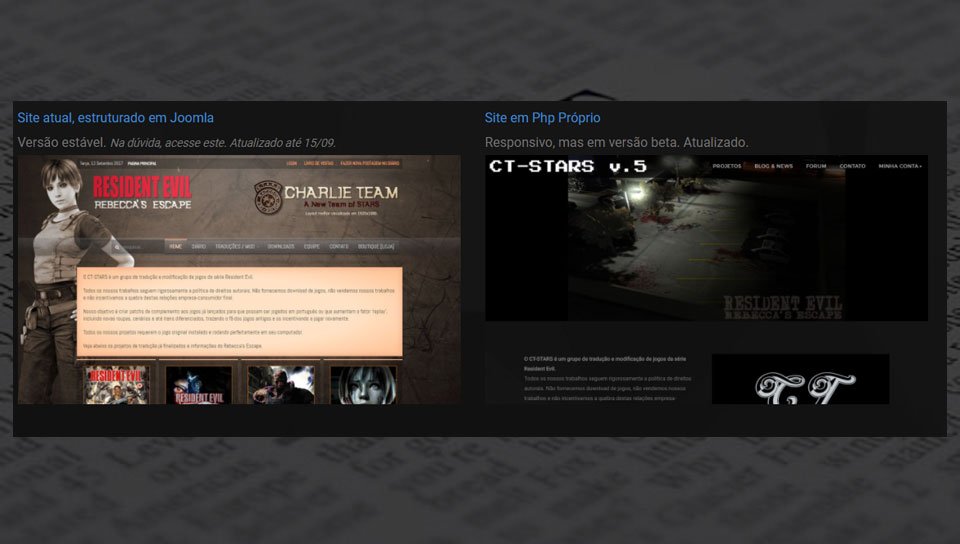 4 - Por fim, nós admitimos que estamos com muita saudade da interação entre nossa equipe e os fãs de Resident Evil ou de Romhacking em geral. Então queremos logo voltar à ativa. E isso vai acontecer de forma mais intensa com este novo modelo de site, construído do zero, totalmente direcionado à utilização para o CT-STARS, seus membros e visitantes.